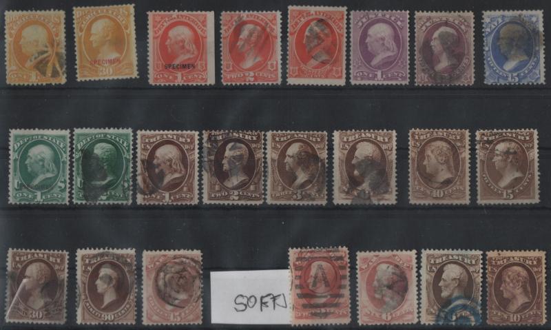 OFFICIALS */O (23) diff 19th Cent incl (3) specimens, on approval card; incl Used: O1, O30, O42, O58, O110, O111, Unused: O25 NG, & specimens (NGAI) O9S, O15S, O57S; cond varies, most sound, VF to Fine, most F-VF (Image)