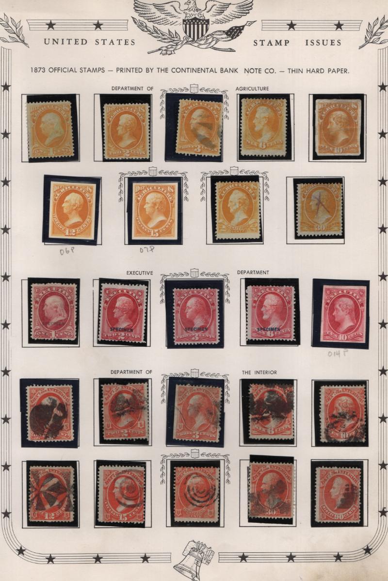 OFFICIALS abt (100+) mounted on (6) album pgs 19th Cent incl Unused: O1 NG, O2, O4 NG, O26, O29, O30, O64, O75, O1S, O10S-13S, O83S & Used: O8, O9, O15-24, O26-28, O31, O32, O34, O35-45, O47-55, O58, O59, O66, O76-82, O84-92, O122, O123 & more, a few plate proofs, high CV; cond varies, flts to most sound, some RG, NG, RP, SP, tears, gen F+ (Image)