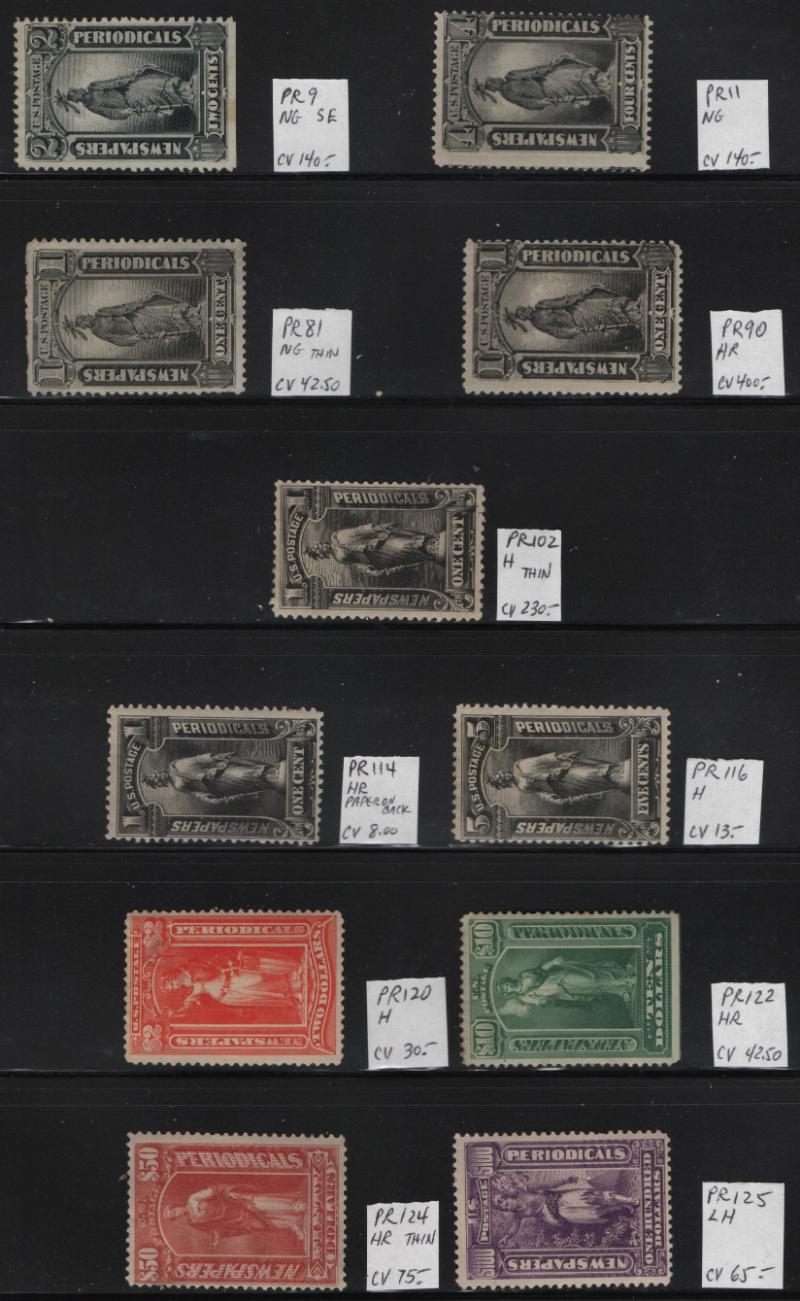 NEWSPAPERS & PERIODICALS, (11) diff, 1875-1897 on stkpg w/ ID; incl PR9 NG SE, PR11 Avg NG, PR90, PR102 thin, PR124 thin, PR125 LH; cond varies, flts to sound, gen Fine to F-VF H/HR/NG (Image)