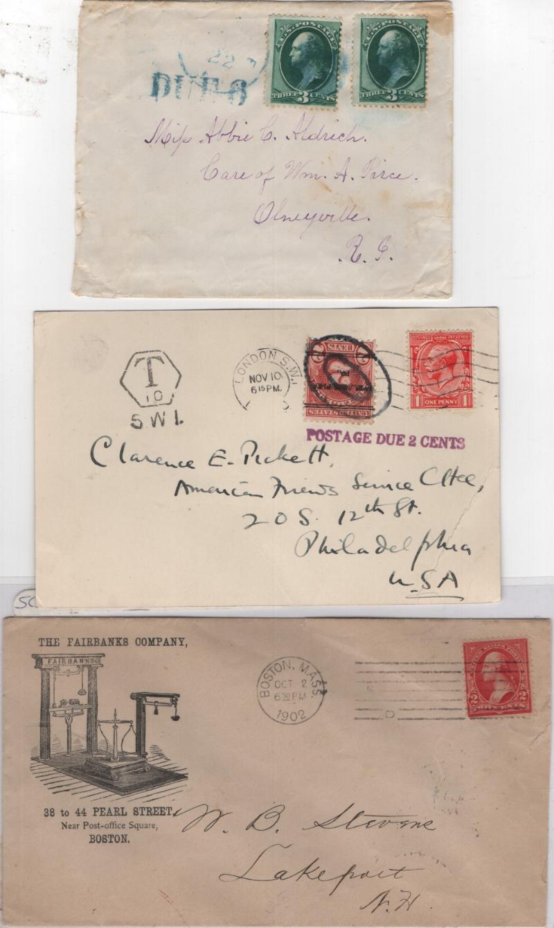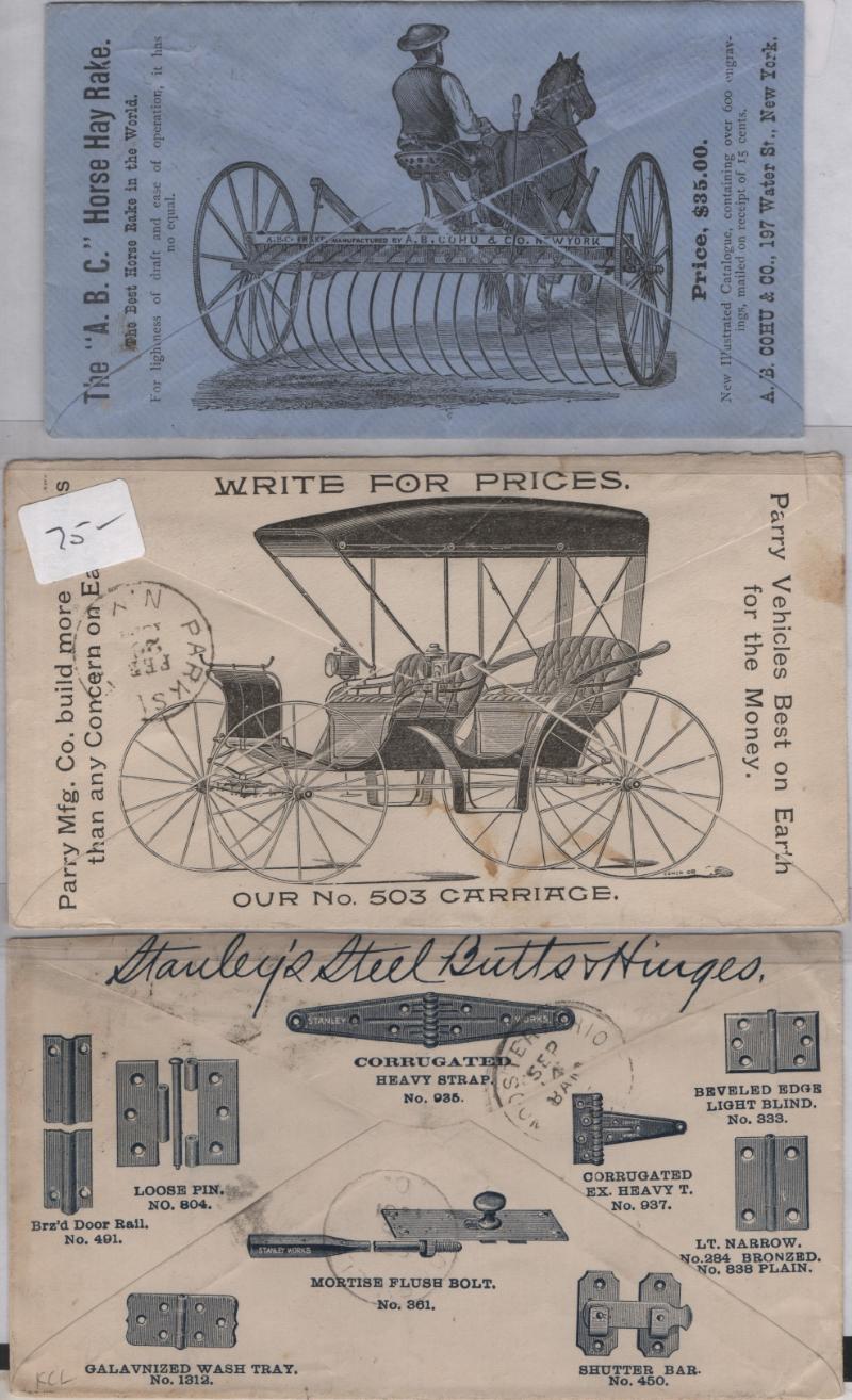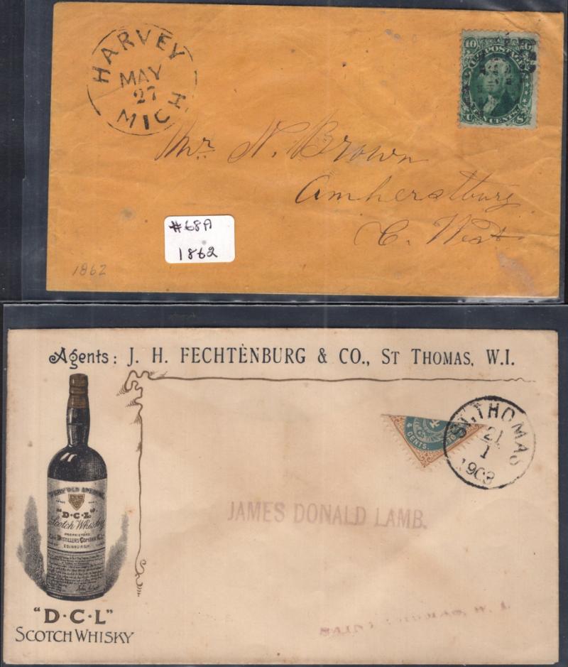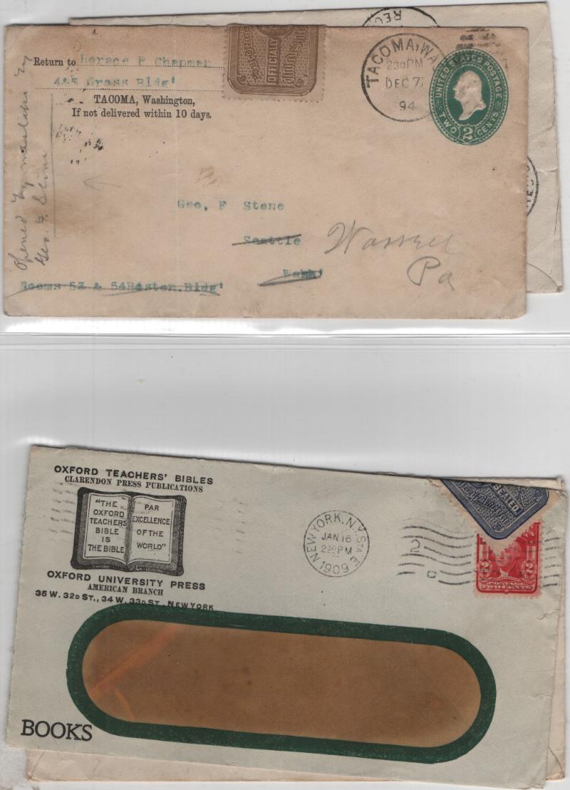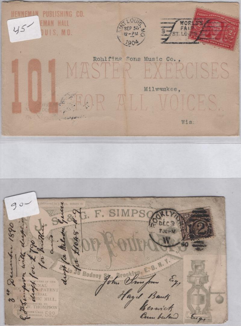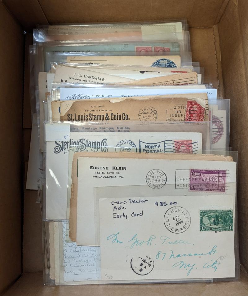 Abt (200) cvrs from US stamp dealers, some sleeved, gen 1880s-1930s; corner cards & labels, some hs, adv services & offers, many familiar names, both of stamp companies & philatelists (Bartels, Long, Scott) & many local names & stamp stores long forgotten; gen F-VF ex-Trenchard (Proceeds benefit APS) (Image)