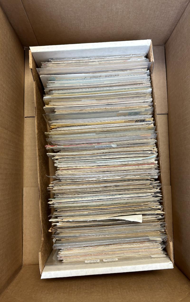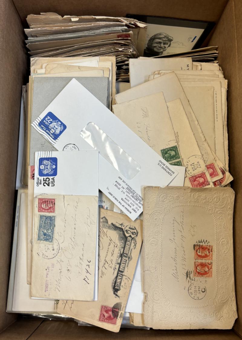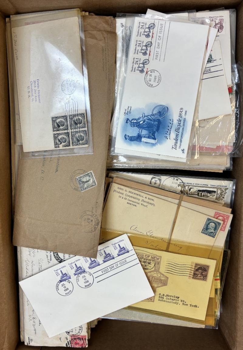 Accum abt (3400+) mainly 20th Cent loose/unsorted in a box & in (18) FDC albums & binders incl comml, personal, FDC, some postal stationery & oversized, mostly #6 & #10 size, abt (300+) 1990s Golden Replicas in (6) albums, also abt (300+) PPC mostly PA, NY & FL, much more, few flts but gen F-VF