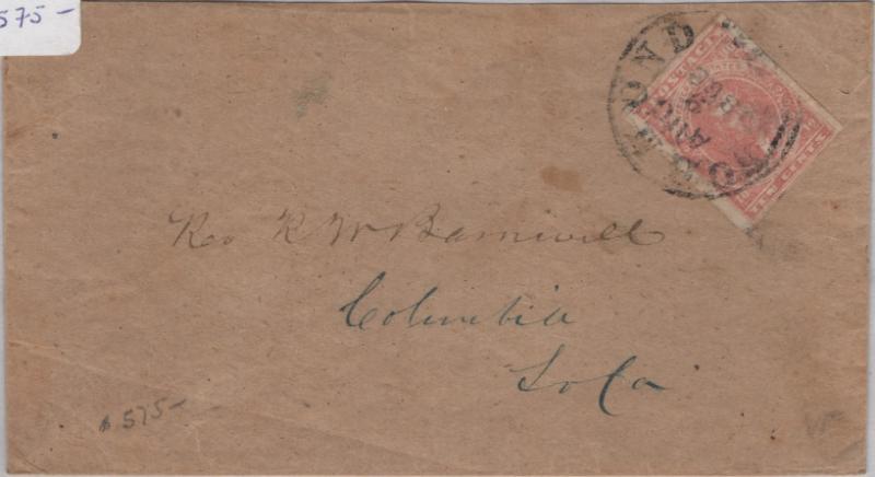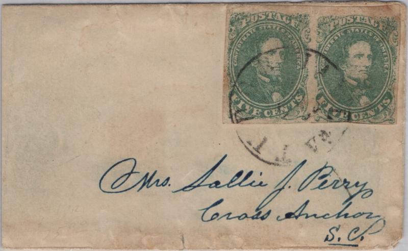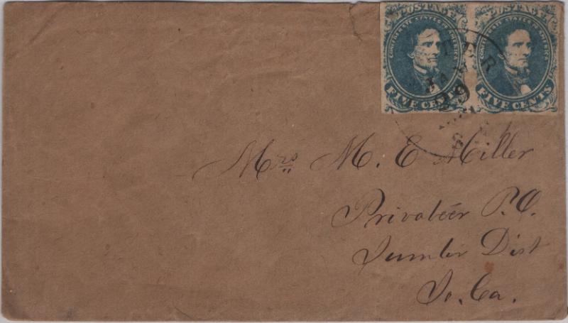4 Davis 5¢ blue, Hz pair, tied by black Sumter, SC pmk, to Privateer, SC, backflap flts, gen F+ (Image)
