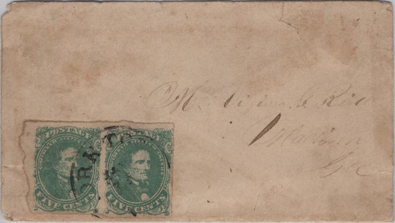 1 Davis 5¢ green, Stone 2, Hz pair tied by black pmk (Yorktown, VA?) addr to Madison, GA, rough but large L margin, scratch paper calculations on back, several flts, F (Image)