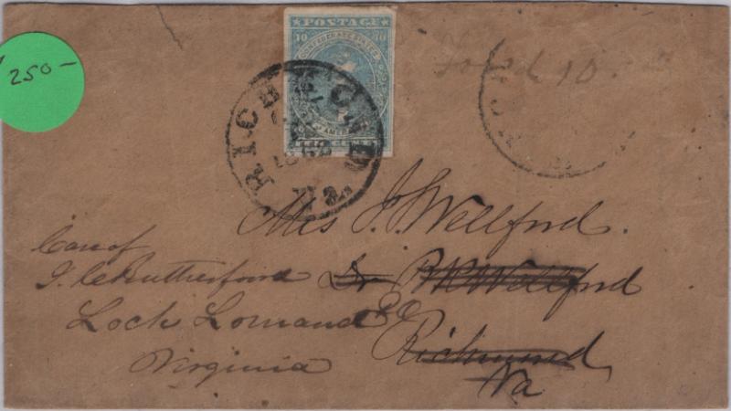 2a Jefferson 10¢ light blue, Paterson, on forwarded cover; originally to Richmond w/ ms "Paid 10" & indistinct pmk, addr forwarded to Lock Lomand, VA w/ stamp added & tied by Oct, 1862 Richmond cds; back flap torn, gen F (Image)