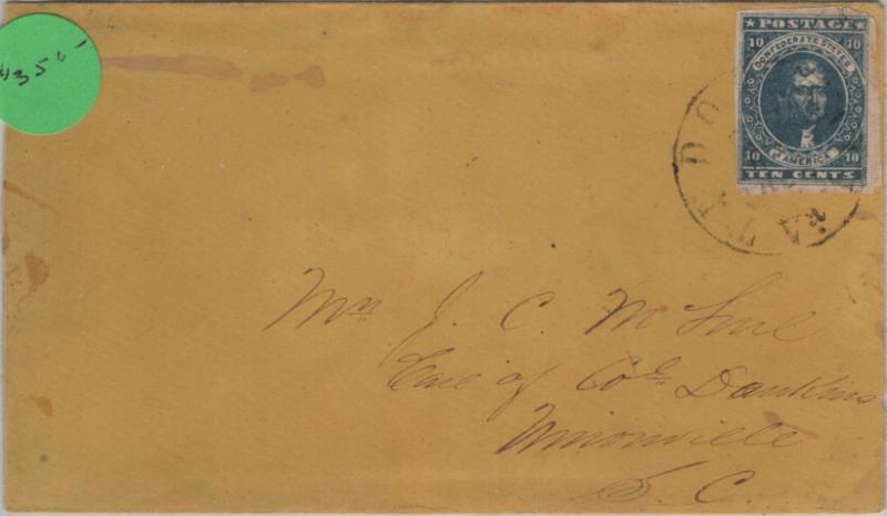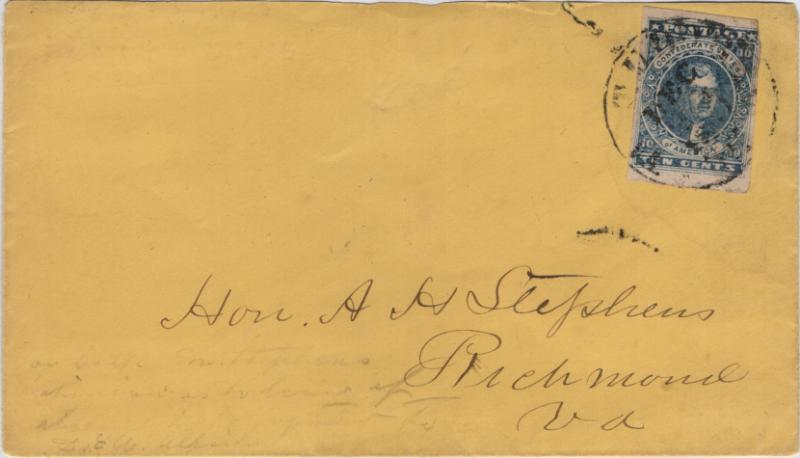 2b Jefferson 10¢ blue, Hoyer printing, (3) large margins just in at UR, tied to yellow cover by Dec, 1861, Tudor Hall, VA black pmk, addr to VP Alexander Stephens at Richmond; backflap missing, notation on reverse dated 23 Dec 1861 refers to a Dr. Alfriend & his desire for furlough; ex-Meroni, F-VF (Image)