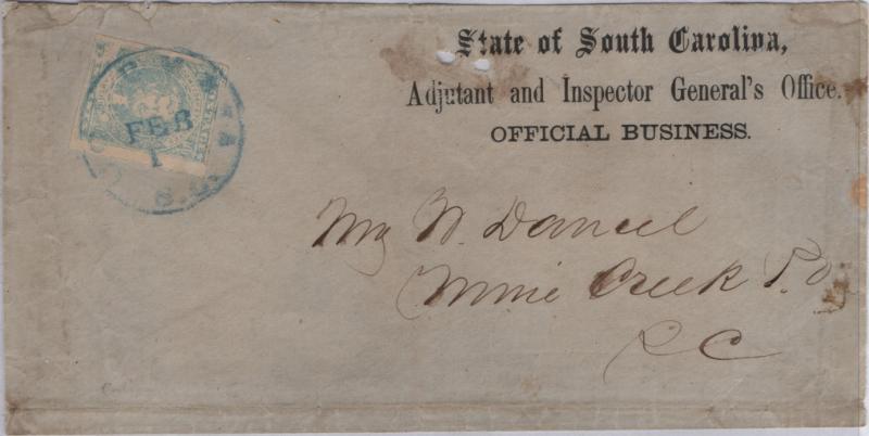 2e Jefferson 10¢ light milky blue Stone Y single tied to "State of South Carolina / Adjutant and Inspector General / Official Business" env (CSA #S-SC-10 CV $400) by blue Columbia, SC pmk; backflap missing, insect hole at top, Kimbrough notes on back; F (Image)