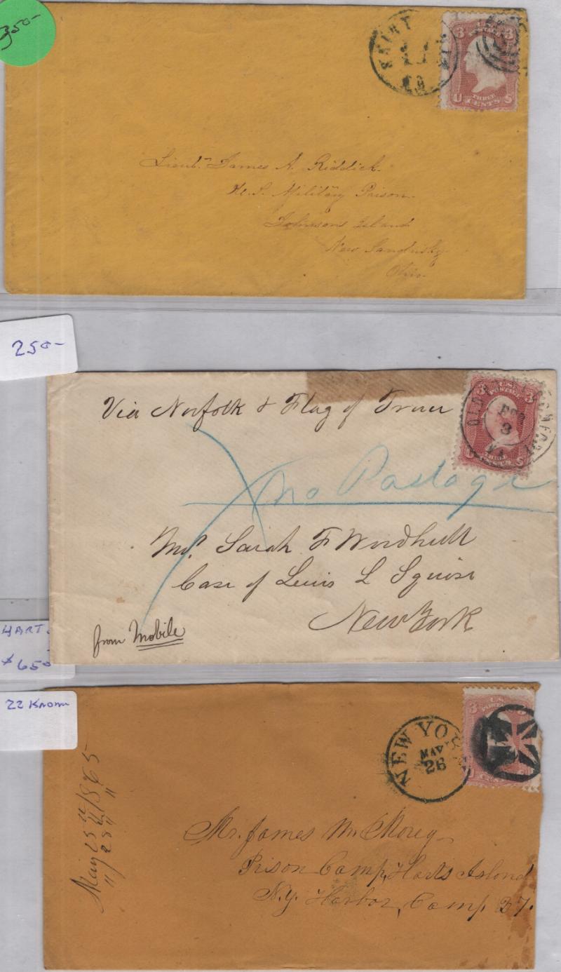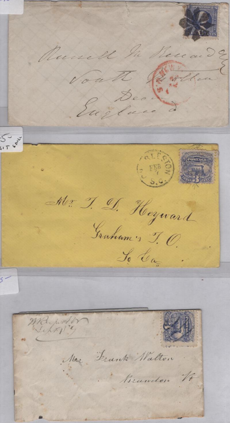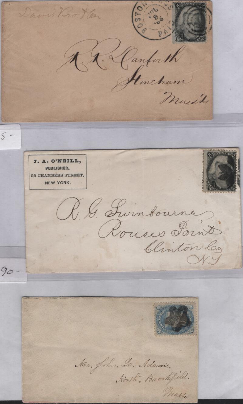 Group (38) covers #26 (35) or 26A (3), all addr to Rev. J.W.Sarles, Brooklyn NY w/ letters; incl 26A tied by New York cds Oct 18 (1858) w/ choir complaint-"lady who lead has a most unharmonious voice"; 26A tied by grid cancel w/ Philadelphia Pa octagon Feb 19, 1859; 26A w/ pen cancel & Banks Ville Nov 11 (1857) ms cancel; #26 w/ cancels from usual large towns but most smaller towns Wilton, Rockville, Stanford CT; Cascade Iowa, plus NY towns Prattsburgh, Cooperstown, Bridgeport, Newton, Shushan, Branch Port, Middletown, plus ms cancel Deer Park Ill; cond mixed, some cvrs roughly opened, edge flts, stains, soiling, creases to sound, stamps Avg-VF most sound