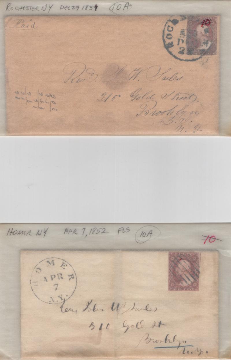 Group (4) #10/10A, 1851-52, all addr to Rev. J.W.Sarles, Brooklyn; one cover w/ letter w/ #10A tied by Rochester Dec 29, 1851 cds (stamp w/ oxidation), two FLS w/ #10A tied by grid cancels & Homer NY Apr 7 & May 3 (1852) cds, one cover & letter w/ #10 w/ ms pen cancel & West Townsend Mass Dec 22 (1852) cds; cond varies, light soiling, couple stains, gen F-VF (Image)