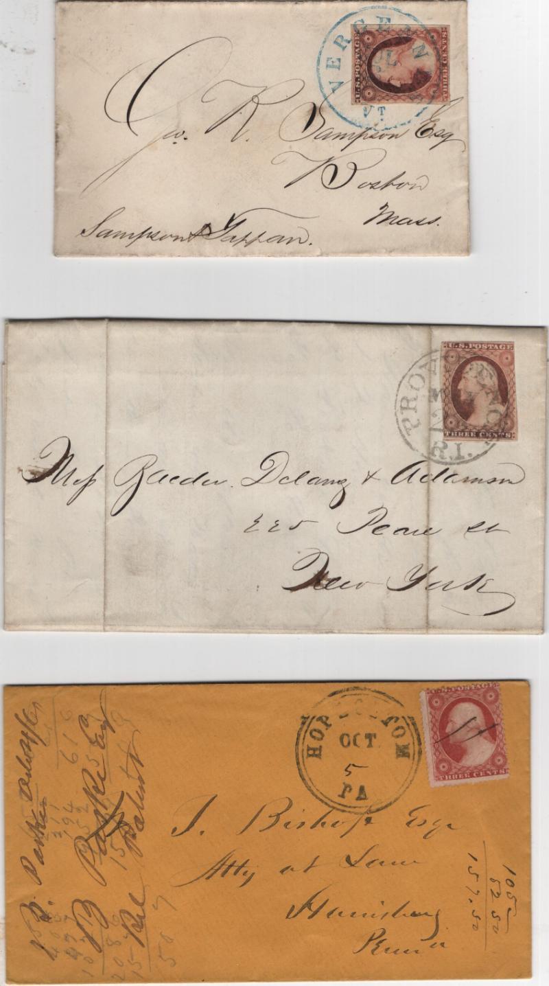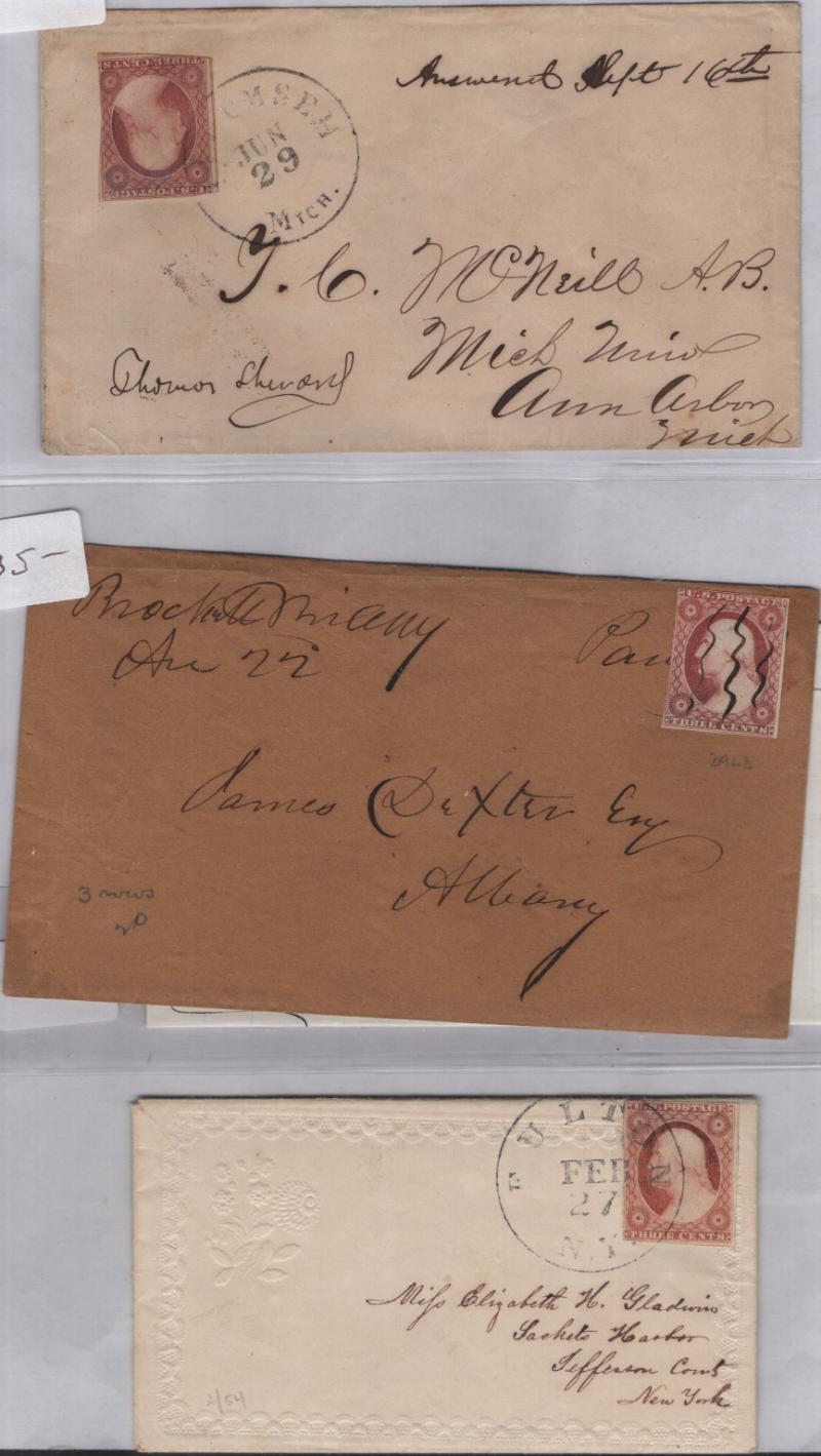 Accum over (70) #11 & 11A on covers/ FLS, much 1856-57, most w/ letters enclosed from family & church business, most addr to Rev. J.W.Sarles-Brooklyn NY, most NY state (much from Prattsburgh) hs & few ms cancels, few adv; cond varies from roughly opened to VF, many in glassines, great lot to search for varieties