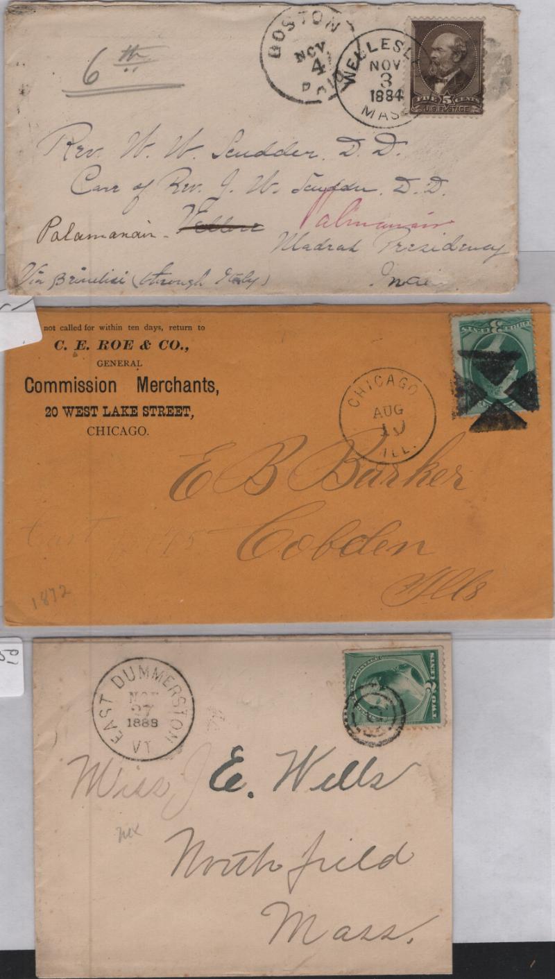 Accum abt (500) 19th Cent to 1920s, most 19th Cent, from Rev. J.W.Sarles corresp; abt (200) #63 thru Bknts, abt (250) Bureaus thru Columbians, abt (50) Wash/Frank & 4th Bureaus; also cover album w/ some better incl #7, 10, 24 pairs & strip/3, 65 w/ steam/ship cancel, few 1890-1900s commems, few special delivery & parcel post; abt (200+) 19th Cent corresp/letters, some in env but hand delivered not mailed; cond mixed, roughly opened, stains, soiling, edge flts, file folds to much sound, gen Fine to F-VF