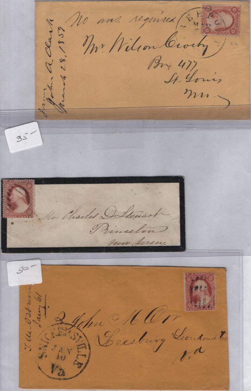 (35) Sleeved cvrs, franked w/ 1857 perforated 3¢ Washington; some labeled w/ Scott #, noted many shades, wide variety of pmk types incl pen, large town, RR, target, Paid, ms town cancel & more; a few corner cards, mourning, ladies, black, blue or red, cond of stamps or covers vary as typical, F++ (Image)