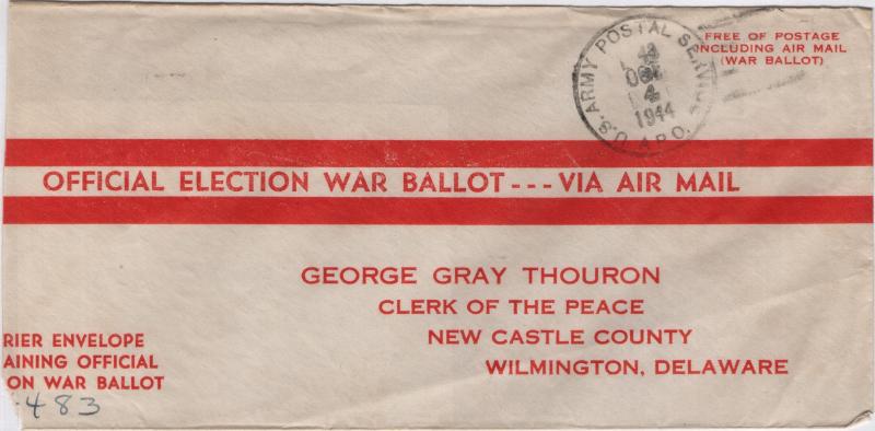 Selection (15) 1944 War Ballot envs to New Castle County clerk in Wilmington, Delaware; owner has IDed the APO numbers, all diff from (12) countries or territories: France, PNG, Hawaii, Alaska, Persia, India, England, Neth, Belgium, Italy, Australia, Solomon Is; F-VF (Image)