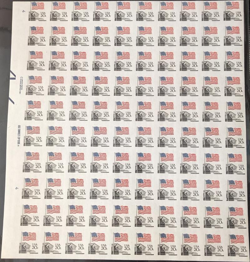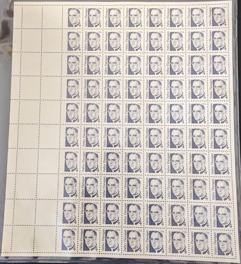 2171d VF+ Father Flanagan 4¢ blue violet, full pane (100) w/ dull gum, first (2) columns & selvage All Color Missing (EP) error, there is an albino impression; the 3rd column has partial color missing (his name); listed but valued with a dash in Scott, one recently sold online for $1,400 (Image)