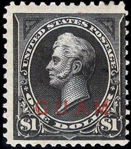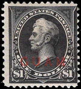 Guam, 1899, $1 Perry, black, type II (Scott 13), pink handstamp on reverse, o.g., hinge remnant, nearly Fine. Scott $4,500. Estimate $1,000 - 1,500. (Image)