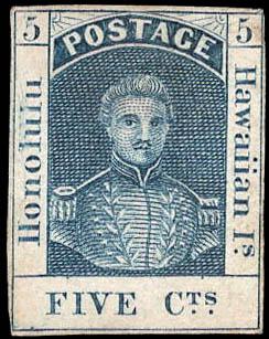 Hawaii, 1853, King Kamehameha III, 5¢ blue on thick white wove paper (Scott 5), nearly 4 margins (huge on 2 sides), o.g., hinged; a repaired tear at left, Very Good to Fine. Scott $1,900. Estimate $300 - 400. (Image)