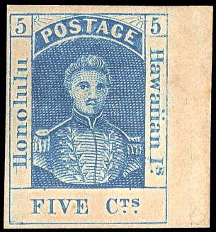 Hawaii, 1853, King Kamehameha III, 5¢ blue on thick white wove paper (Scott 5), right sheet margin single, large margins all around, o.g., small hinge remnant; a light horizontal crease towards the top, otherwise Extremely Fine. Scott $1,900. Estimate $500 - 750. (Image)