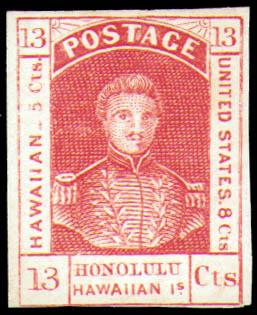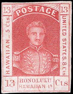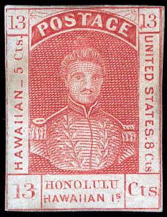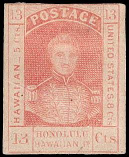 Hawaii, 1868, King Kamehameha III, 13¢ dull rose, re-issue (Scott 11), mostly large margins except at top, o.g., hinged; pencil notation on reverse, about Fine. Scott $325. Estimate $75 - 100. (Image)