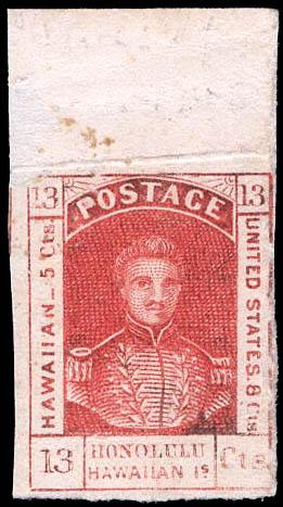 Hawaii, 1853, King Kamehameha III, 13¢ dark red on thick white wove paper (Scott 6), top sheet margin single, o.g., never hinged (hinged in the selvage only); crease just above the stamp where the selvage begins; some minor oxidization, Fine to Very Fine appearance. Scott $900. Estimate $150 - 200. (Image)