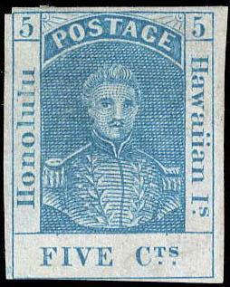 Hawaii, 1853, King Kamehameha III, 5¢ blue on thick white wove paper (Scott 5), 4 full margins, o.g., hinged, Very Fine, with 2026 P.F. certificate, unusually nice for this issue. Scott $1,900. Estimate $1,000 - 1,500. (Image)