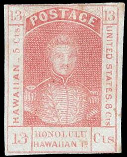 Hawaii, 1868, King Kamehameha III, 13¢ dull rose, re-issue (Scott 11), 4 margins, unused without gum; minute stain on reverse at top, otherwise Fine. Scott $325 for o.g. Estimate $75 - 100. (Image)