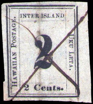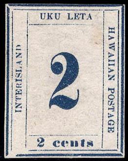 Hawaii, 1865, Numeral, 2¢ dark blue (Scott 26), position 10-A-III, almost 4 margins (close or touching at top), unused without gum; pencil notations on reverse, nearly Fine. Scott $350. Estimate $75 - 100. (Image)
