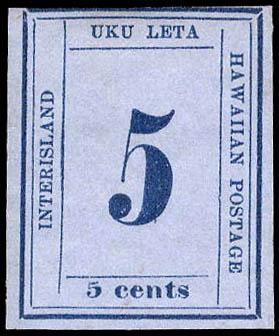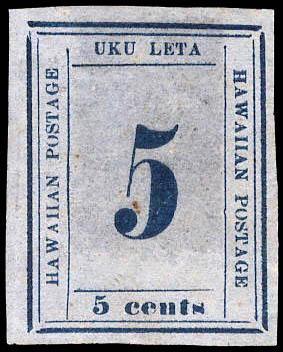 Hawaii, 1865, Numeral, 5¢ blue on blue (Scott 22), position 12-A-IX, large margins except at top, red and purple and stamps on reverse, unused without gum, Fine overall. Scott $575. Estimate $150 - 200. (Image)