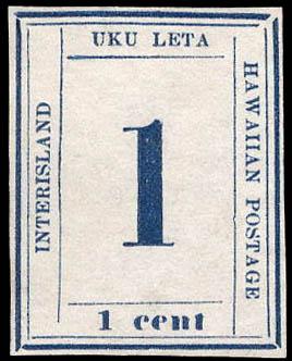 Hawaii, 1865, Numeral, 1¢ dark blue (Scott 25), position 11-A-IX, 4 margins, unused without gum, Fine. Scott $350. Estimate $120 - 180. (Image)