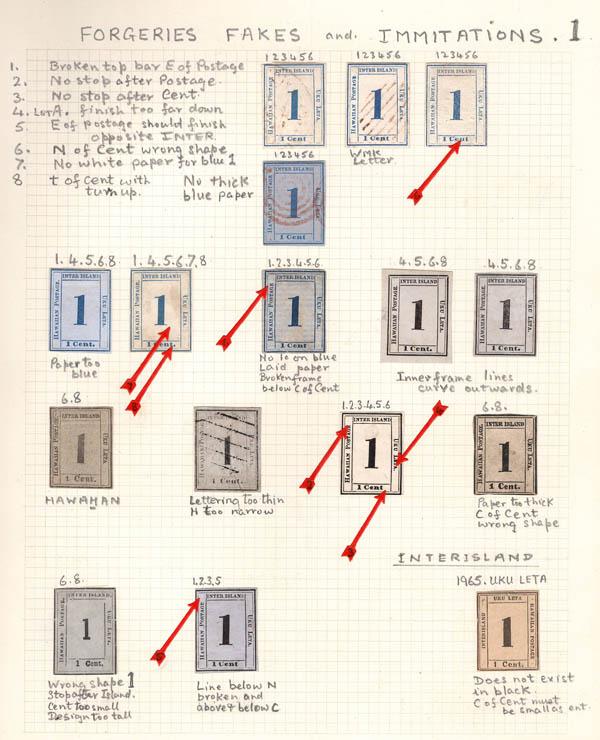 Hawaii, 1859-65, Numeral Issue, a useful reference collection of forgeries, fakes and imitations, a neat well-annotated work featuring 32 examples mounted on three album pages. Estimate $100 - 150. (Image)