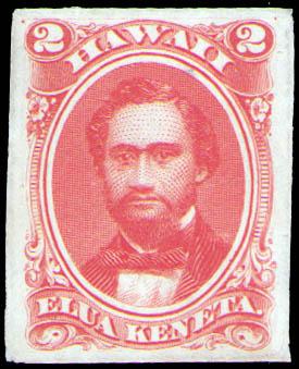Hawaii, 1864, King Kamehameha IV, 2¢ rose vermilion, plate proof on India paper (Scott 31P3), 4 large margins, very bright and fresh, Extremely Fine. Scott $400. Estimate $250 - 350. (Image)