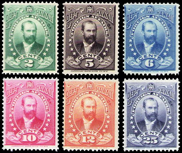 Hawaii, Officials, 1896, 2¢ to 25¢ complete (Scott O1-O6), bright fresh colors, o.g., never hinged, Fine to Very Fine. Scott $600. Estimate $350 - 500. (Image)