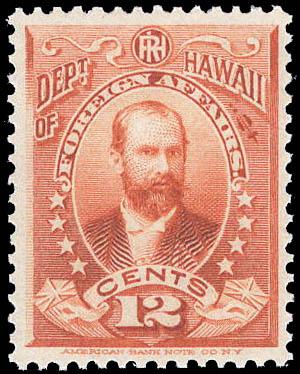 Hawaii, Official, 1896, 12¢ orange (Scott O5), beautifully fresh and well centered, o.g., never hinged, Very Fine or better. Scott $110. Estimate $75 - 100. (Image)