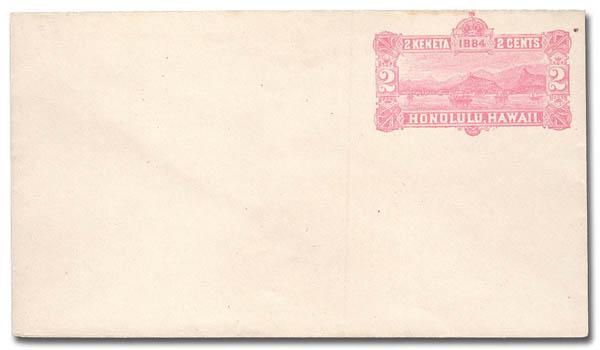 Hawaii, Envelope, 1884, 2¢ rose, blue inside (Scott U6), mint entire; minute toning at top right, otherwise Very Fine. Scott $425. Estimate $150 - 200. (Image)