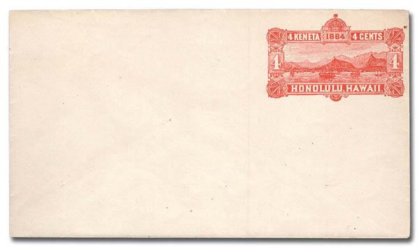Hawaii, Envelope, 1884, 4¢ red, blue inside (Scott U7), mint entire, Very Fine. Scott $425. Estimate $200 - 300. (Image)