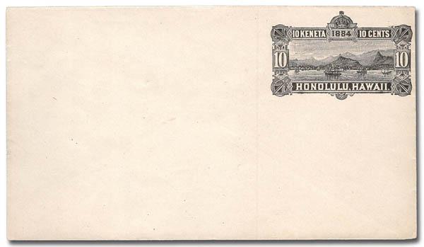 Hawaii, Envelope, 1884, 10¢ black, blue inside (Scott U9), mint entire, Very Fine. Scott $525. Estimate $250 - 350. (Image)