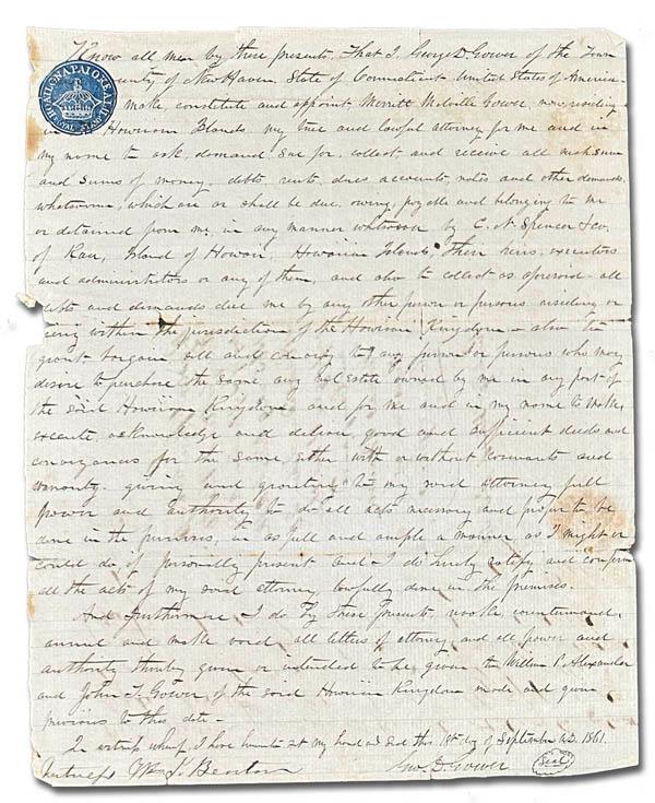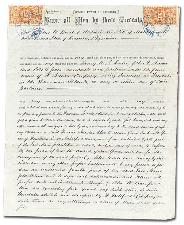 Hawaii, 1861, Power of Attorney, with printed blue Royal tax stamp; an interesting early document, Fine. Estimate $300 - 400. (Image)