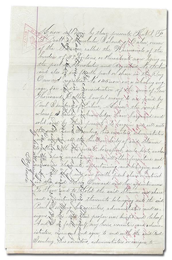 Hawaii, 1878, Deed of Sale of the Steamer Waimanalo, for the sum of $10,000; executed by the Collector General's Office and signed by Deputy Collector General with the seal of office, Very Fine. Estimate $500 - 750. View a PDF of images for this lot(Image)