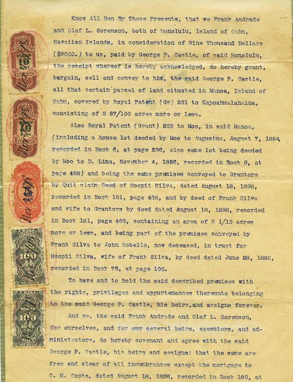 Hawaii, 1898, Real Estate Deed, typewritten, 2 pages, folded, with notary seal at the end, bearing 5 Hawaiian revenue stamps. The revenue stamps (R3 x2, R4, R5 x2) total $2.25 face value, Fine to Very Fine. Scott catalog value as used singles off-cover comes to $175. Estimate $200 - 300. (Image)