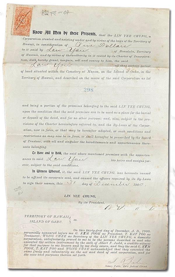 Hawaii, 1900, Burial Plot Receipt, with an R2 stamp along with Notary Public First Judicial Circuit seal, Very Fine. Estimate $100 - 150. (Image)