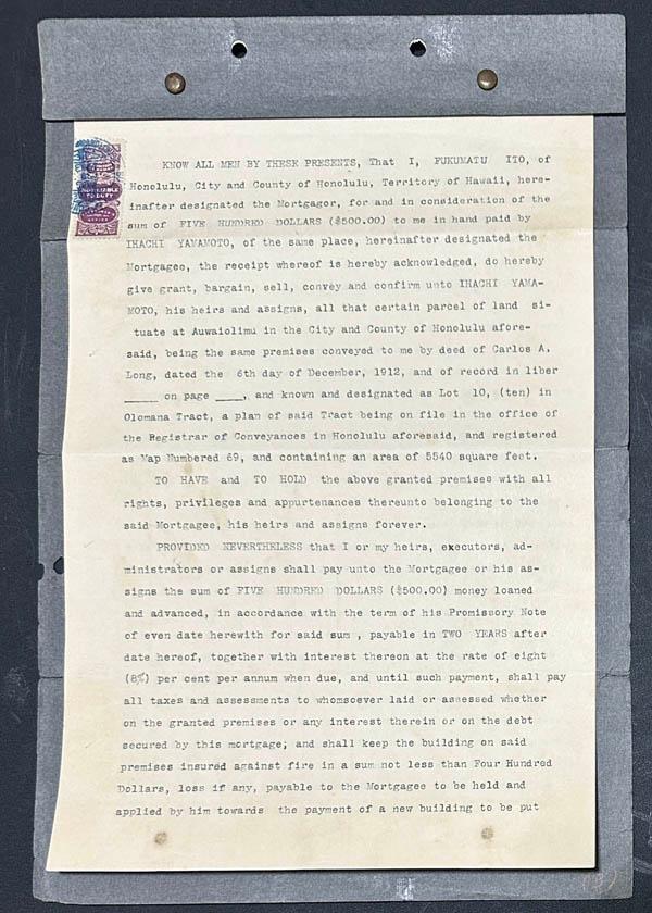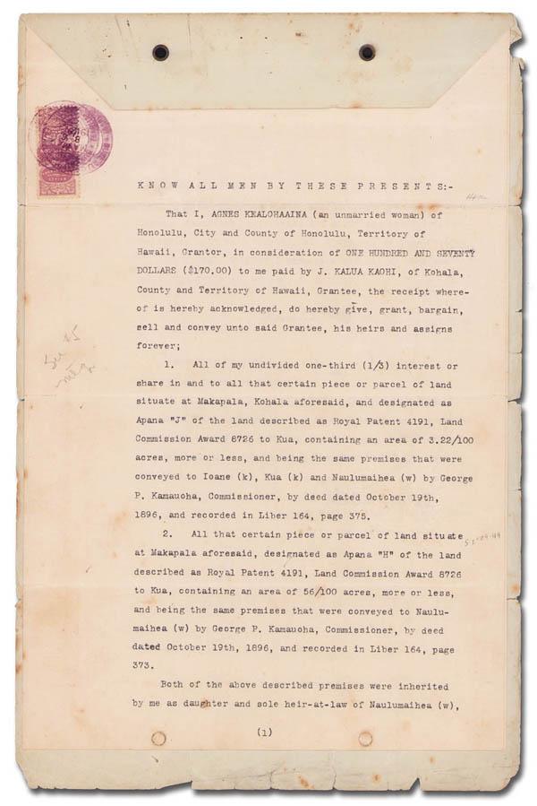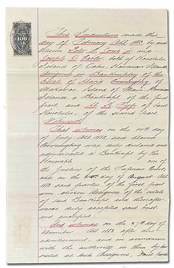 Hawaii, 1912, Real Estate Deed, bearing the 1901-10 "Territory of Hawaii / Not Liable To Duty" stamp (M-H 463). Some modest age flaws but in good condition overall, Fine to Very Fine. Estimate $300 - 400. (Image)