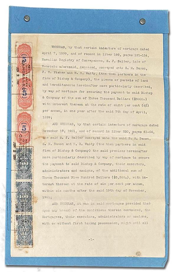 Hawaii, Revenue, 1877, $1 black and $5 vermilion & violet blue (Scott R3, R4), 2 pairs and two singles tied to a 4 page Mortgage document dated April 7, 1899; this document was signed and notarized by W. L. Stanley, a prominent legal figure during the early 1900's, Very Fine. Estimate $300 - 400. (Image)