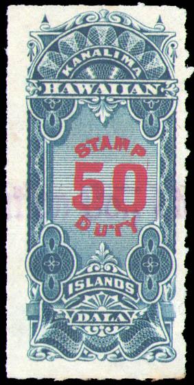 Hawaii, Revenue, 1877, $50 slate blue & carmine (Scott R6), faintly canceled, Fine to Very Fine. Scott $450. Estimate $250 - 350. (Image)