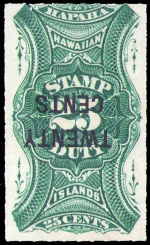 Hawaii, Revenue, 1893-94, 20¢ on 25¢ green, surcharge inverted (Scott R7a), a striking error, o.g., never hinged, Fine. Scott $1,250. Estimate $600 - 800. (Image)