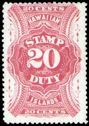 Hawaii, Revenue, 1894, 20¢ red (Scott R9), excellent color, dry o.g., very lightly hinged, Fine. Scott $375. Estimate $150 - 200. (Image)