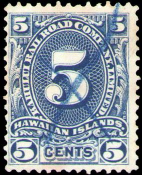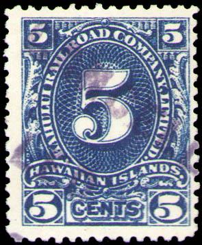 Hawaii, Kahului Railroad, 1898, 5¢ dark blue, Schmidt printing (Meyer-Harris 157), neat violet cancels, fresh, Fine to Very Fine. Estimate $150 - 200. (Image)