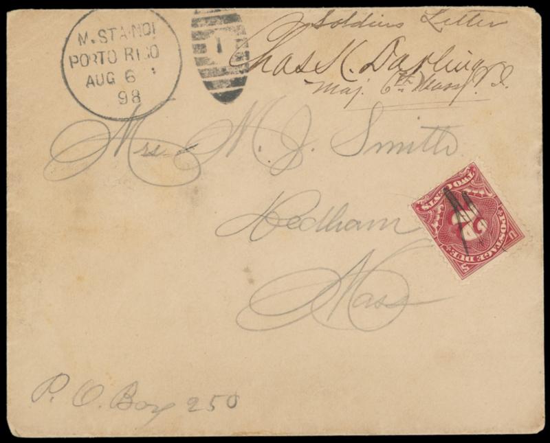 M. Sta. No. 1, Porto Rico, Aug 6 '98 (Playa de Ponce). Clear railway duplex on buff 1898 cover with patriotic crossed flag design endorsed "Soldiers Letter, Chas. K. Darling, Maj. 6th Mass. V.I." to Dedham Mass., 2¢ postage due canceled by manuscript, Dedham (8.16) arrival backstamp; some mounting abrasion on reverse, F.-V.F.,ex-Kugel. Estimate; $150 - 200.