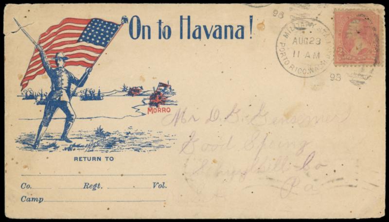 Military Sta. 1, Porto Rico, Wash. D.C., Aug 23 '98. Duplex ties 2¢ carmine (279B), corner faulty, on "On to Havana!" patriotic design showing Soldier and Flag in Havana Bay addressed to Good Spring Pa., Philadelphia (8.30) backstamp transit, enclosed letter datelined "Guayama Aug 18th 98" just five day before Military Station No. 2 opened at Guayama; upper left corner torn, light aging, Fine. Estimate; $100 - 150. US$100-150 (Image)