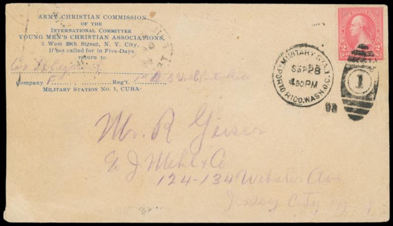 Military Sta. 1, Porto Rico, Wash. D.C., Sep 28, 98. Clear duplex ties 2¢ rose pink (279Bc) on Military Station No. 1 Cuba YMCA blue imprint cover to Kersey City N.J., reverse with Philadelphia (10.7) transit and Jersey City (10.7) arrival cds, Very Fine,ex-Kugel. Estimate; $100 - 150. US$100-150 (Image)