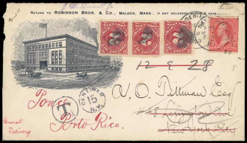 Military Sta. 1, Porto Rico, Wash. D.C., Rec'd, Apr 26, 99. Bold backstamp on 1899 illustrated building ad cover bearing U.S. 2¢ red (279B) tied by "Malden Mass. Apr 18, 99" duplex to New York City, forwarded to Ponce, Puerto Rico with 2¢ Postage Due, pair and single, each canceled by cork cancel, New York "T, 15 Centimes" due handstamp, slightly rough opening at left, 2¢ due single with corner flaw, F.-V.F. Estimate; $100 - 150.