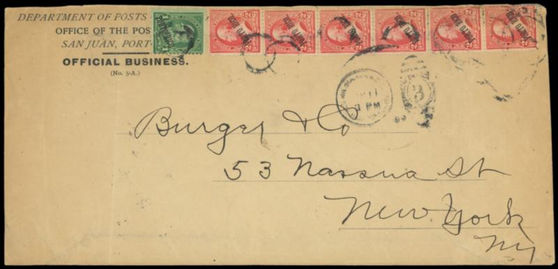 Mil. Sta. No 4, W.D.C., San Juan, Porto Rico, Nov 11, 99. Duplex strikes tie Porto Rico 1¢ green (210a) and 2¢ reddish carmine (211) vertical strip of six on legal-size Department of Posts, San Juan, Porto Rico imprint cover to Burger & Co., New York City; some cover wrinkling, stamp creasing and flaws with bottom 2¢ corner repaired, Fine appearance. Estimate; $100 - 150. US$100-150 (Image)