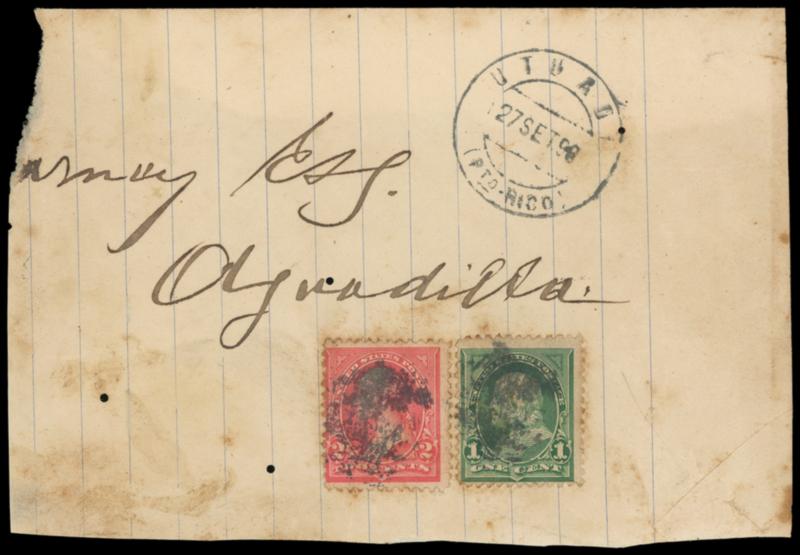 Utuado, Pto.-Rico, 27 Set. 98. Unusually clear strike of double-circle datestamp on cover piece bearing U.S. 1¢ green (279) and 2¢ rose carmine (279Bc) to Aguadilla; some toning, few worm holes, Fine and rare piece. Estimate; $75 - 100.